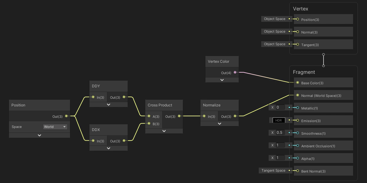 output.worldPosition = mul(unity_ObjectToWorld, vertex.position);This position is then used to calculate the world-space normal in the fragment shader ProcessFragment() method: